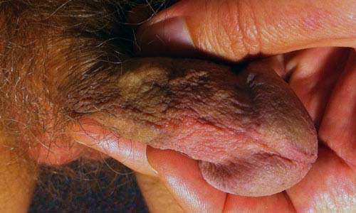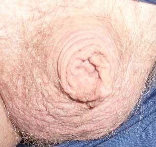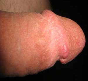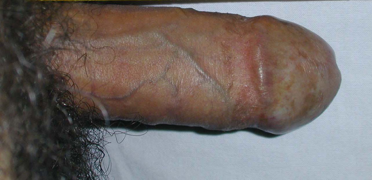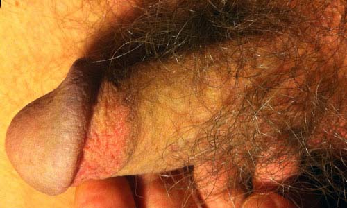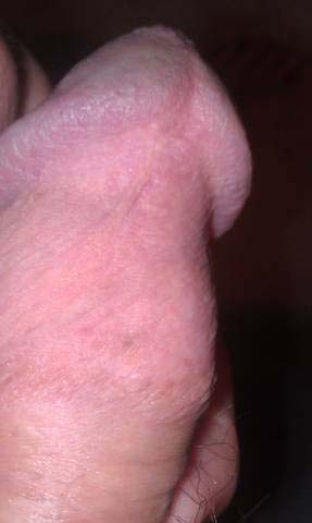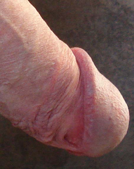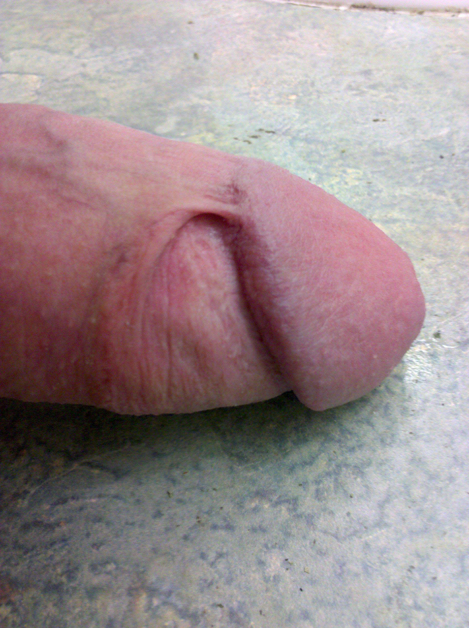 [all circumcised men have a scar on the penis; photo at right depicts one possible position. More scar photos at Wikipedia.]