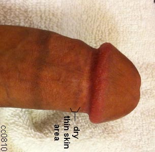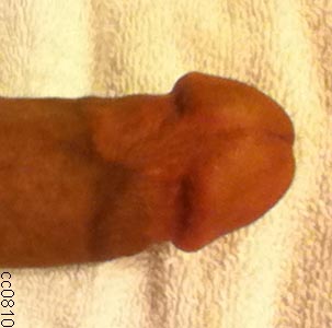 [all circumcised men have a scar on the penis; photo at right depicts one possible position. More scar photos at Wikipedia.]